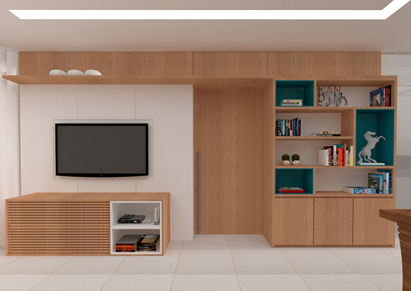 Trabalho . Este apartamento pertence a uma família com um casal e duas crianças. O intuito do projeto foi propor uma decoração que trouxesse mais vida e aconchego. Os ambientes receberam pontos de cor e uma marcenaria em tons de branco e madeira, além disso as paredes foram revestidas por papéis de paredes geométricos e modernos. A maior exigência dos moradores é que houvesse locais para guardar livros e cantinhos de leitura em quase todos os cômodos, as prateleiras, nichos e luminárias de leitura estão presentes em todos os espaços.