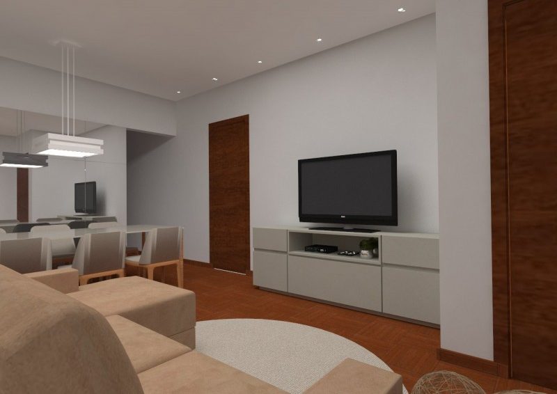 Trabalho . O projeto de interiores desse apartamento é um reflexo da personalidade dos moradores, recém-casados simples e modernos. A sala, espaço de socialização, é aconchegante e causa uma sensação de amplidão devido ao espelho e ao uso de móveis baixos. O home-office com armários planejados é compacto e o layout já foi pensado caso tenham dois filhos. Os pontos de destaque para a decoração do quarto foram o papel de parede de chevron, a arandela que proporciona um ambiente com luz indireta e a cabeceira com frisos em tons de cinza. Belo Horizonte – MG.