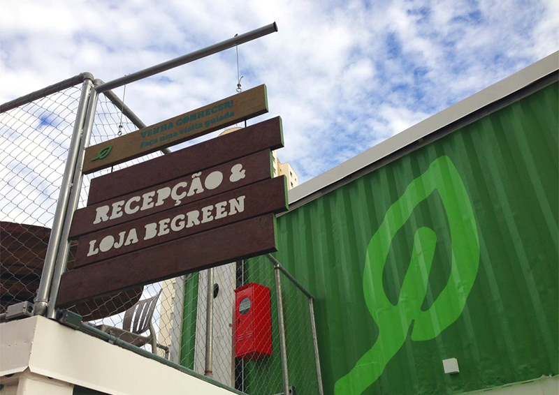 Trabalho . New 360º – Criação de sinalização da primeira fazenda urbana da América Latina – BeGreen Boulevard. A ideia da sinalização é reforçar o lado da fazenda utilizando a textura de madeira em suas peças, como também utilizar uma linguagem mais urbana como o stencil na tipografia. O uso de materiais alternativos para a sinalização (ecoblock, containers), técnicas despojadas (stencil) e cores fortes trazem um viés contemporâneo ao projeto. O resultado final da sinalização é uma linguagem e identidade que ressalta o propósito ecológico da empresa. (ecoblock e cores presentes na natureza).