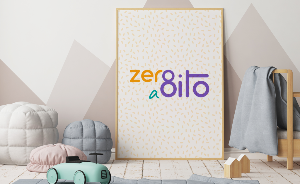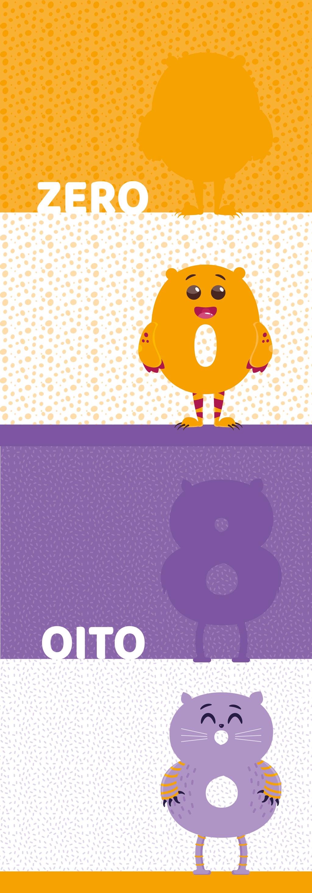 Defesa da identidade visual: a tipografia utilizada, com cantos arredondados, conecta-se com o universo das crianças, e ainda é amigável e humana. O encontro da letra “o” da palavra zero com a letra “o” da palavra oito, forma o numeral. E por último, apenas na letra “a” foi utilizada uma fonte manuscrita para separá-la das outras palavras e facilitar a leitura da informação.