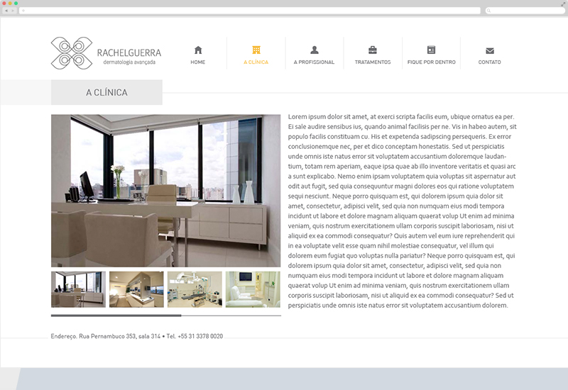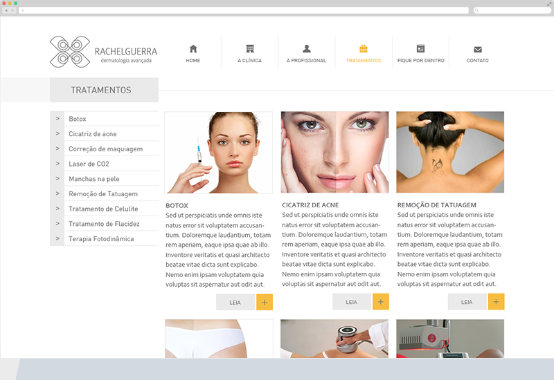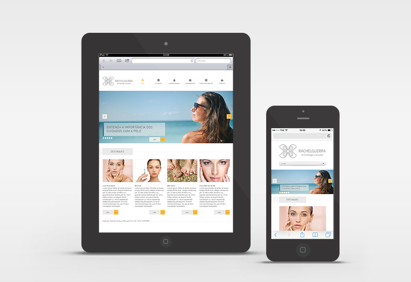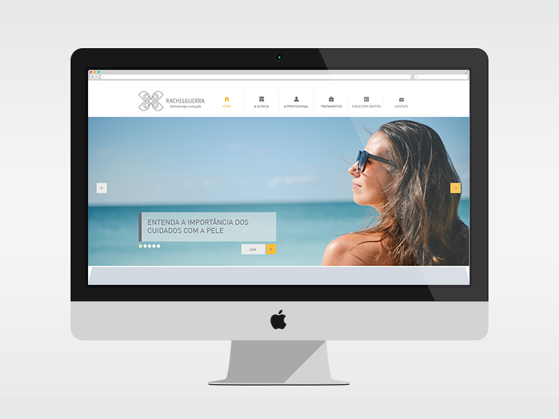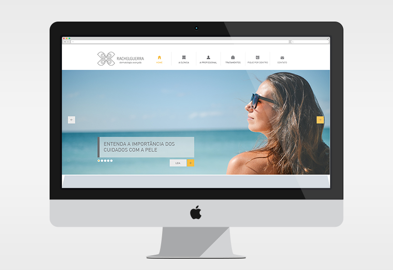 Trabalho . Coletivo AD . Parceria com Andréa Miranda – Criação do layout do site da dermatologista Rachel Guerra, a aparência clean tem o intuito de trazer a sensação de assepsia e os ícones e a organização do conteúdo mais denso dão leveza à proposta. Houve um cuidado maior para o site ser responsivo e se adequar bem a tela do computador, tablets e celulares.
