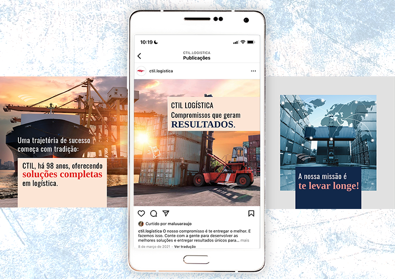 Trabalho . Agência Life – Projeto de identidade visual das redes sociais da CTIL, Cranston Transportes Integrados Ltda, uma empresa especializada em gestão e operações de logística nos segmentos de operações portuárias, transporte rodoviário, armazém de cargas e terminais. A linguagem gráfica transmite seriedade com formas retangulares e cores sólidas que são retiradas da paleta de cor da marca. As interferências em vetor trazem leveza e uma proposta mais amigável para promover esse conteúdo que é mais denso.